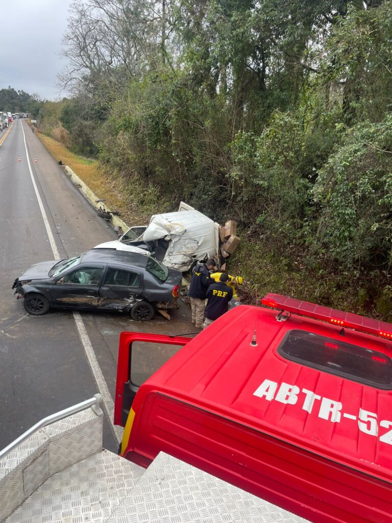 No local, constatou-se que os veículos envolvidos eram, um Renault Clio, uma Van Master/Renault, um VW Gol e uma Fiat Fiorino. O Fiat Fiorino apresentava uma vítima fatal, um homem adulto que estava encarcerado no veículo. Ele foi desencarcerado entregue à Polícia Rodoviária Federal e Polícia Científica para os procedimentos legais.