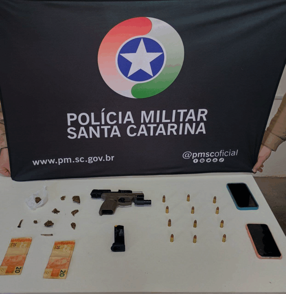 Os policiais encontraram uma pistola G2C calibre 9mm, com acessório de laser, 12 munições intactas, carregador e numeração suprimida. Além disso, com o auxílio de um cão farejador, foram localizadas porções de maconha, inclusive uma escondida no bolso da jaqueta do abordado.