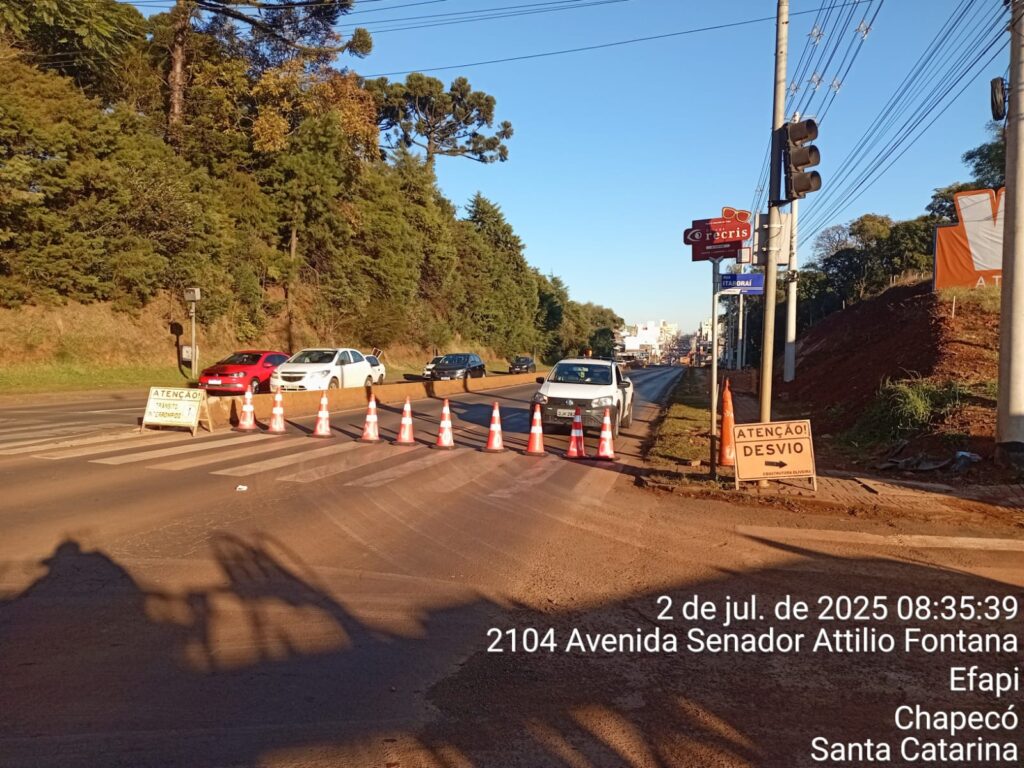 Durante esse período, o trânsito está sendo desviado pela Rua Itaboraí, com passagem pela Unochapecó e descida pela Servidão Anjos da Guarda. Já no sentido Bairro/Centro, o fluxo segue liberado normalmente pela Attilio Fontana.