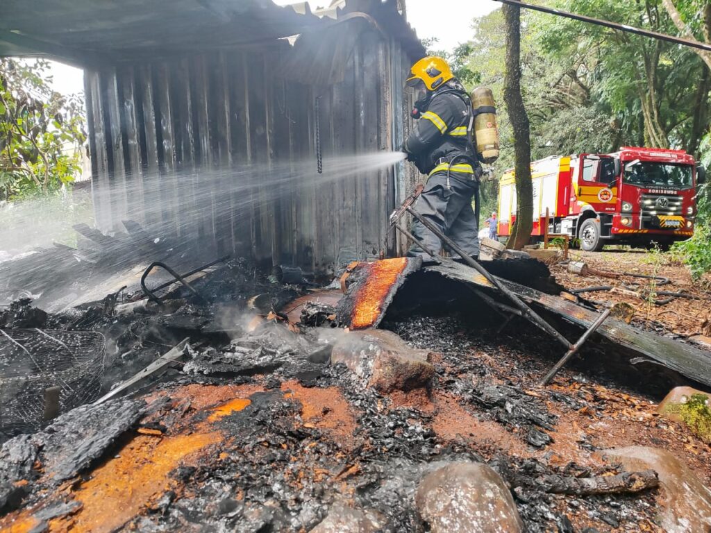 O Corpo de Bombeiros Militar de Chapecó atendeu, neste domingo (15), uma ocorrência de incêndio em um galpão na Linha Colônia Cella, interior do município. Ao chegar ao local, a guarnição constatou que se tratava de um galpão anexo à residência, utilizado para armazenamento de ferramentas e lenha, com área aproximada de 30m², sendo metade da estrutura fechada e metade composta apenas por cobertura.
