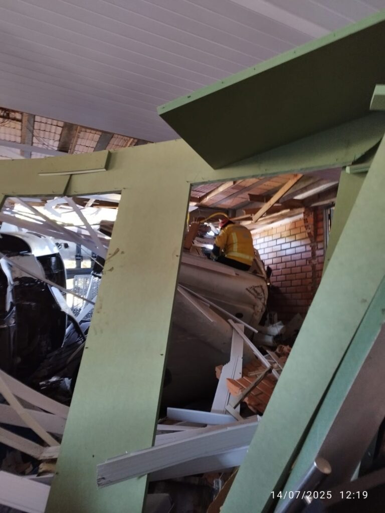 A guarnição dos bombeiros de Faxinal dos Guedes, prestou apoio no local, onde a estrutura da edificação apresentava danos significativos e risco de desabamento. A área foi isolada com o auxílio da Polícia Militar, e o proprietário da empresa foi orientado quanto à segurança do espaço até uma avaliação técnica mais detalhada.
