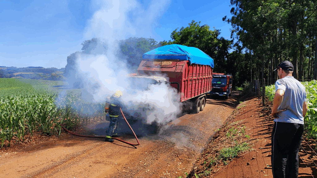 Um caminhão ficou parcialmente destruído após pegar fogo na manhã desta quarta-feira (22), por volta das 10h, na Linha Navegantes, interior de Pinhalzinho, no Oeste catarinense. O veículo transportava uma carga de maravalha quando as chamas atingiram a cabine.