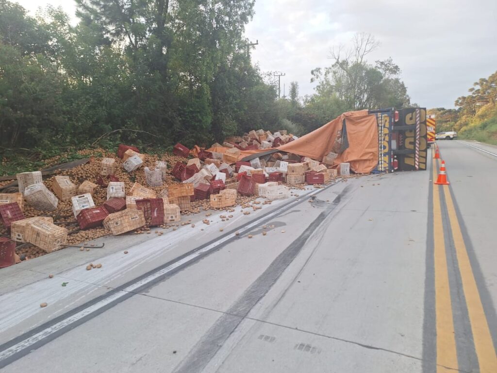A ocorrência foi registrada por volta das 17h15. No local, os policiais constataram um tombamento de um caminhão trator, acoplado a um semirreboque carregado com caixas de batatas. O condutor, de 57 anos, morreu no local.