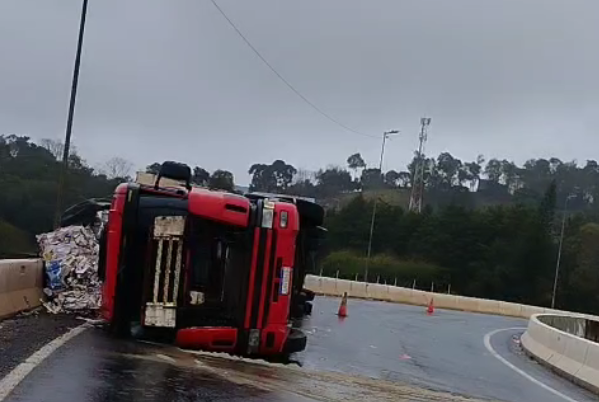 Parte da carga de papel reciclável transportada caiu sobre as duas rodovias, causando o bloqueio total do trânsito no local. Não houve registro de vítimas no acidente. Equipes responsáveis atuam na remoção da carga e do veículo para liberação da via, que permanece interditada. O trânsito apresenta lentidão nos acessos à cidade.