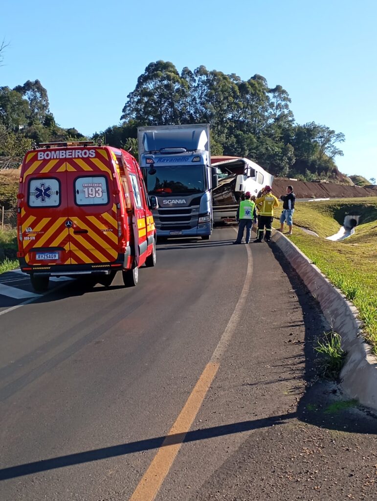 A ocorrência foi atendida pelas guarnições do Corpo de Bombeiros Militar de Santa Catarinas, que constataram uma colisão traseira entre os veículos. O condutor do caminhão que colidiu com a traseira do outro estava consciente, orientado, com sinais vitais estáveis e caminhava pela via, sem ferimentos.