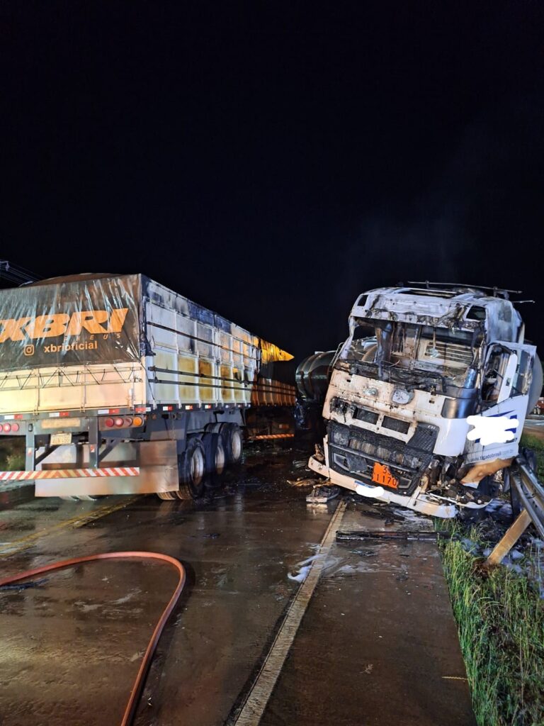 O condutor da carreta incendiada conseguiu sair do veículo por conta própria e recusou atendimento pré-hospitalar.