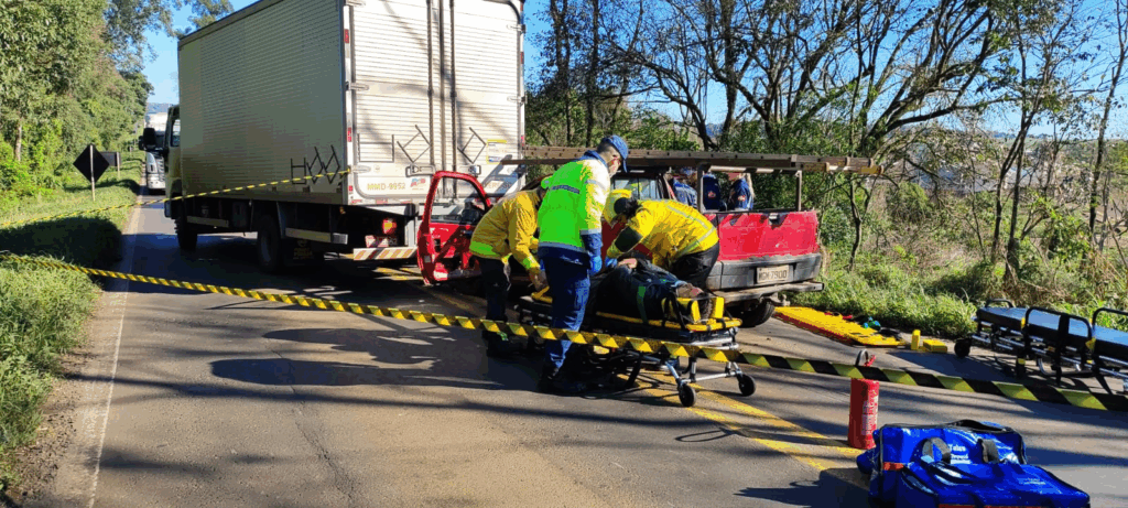 Um acidente de trânsito envolvendo um automóvel e um caminhão deixou três pessoas feridas na manhã desta quarta-feira (10), por volta das 8h, na SC-283, saída para São Carlos, em Guatambu, no Oeste de Santa Catarina.