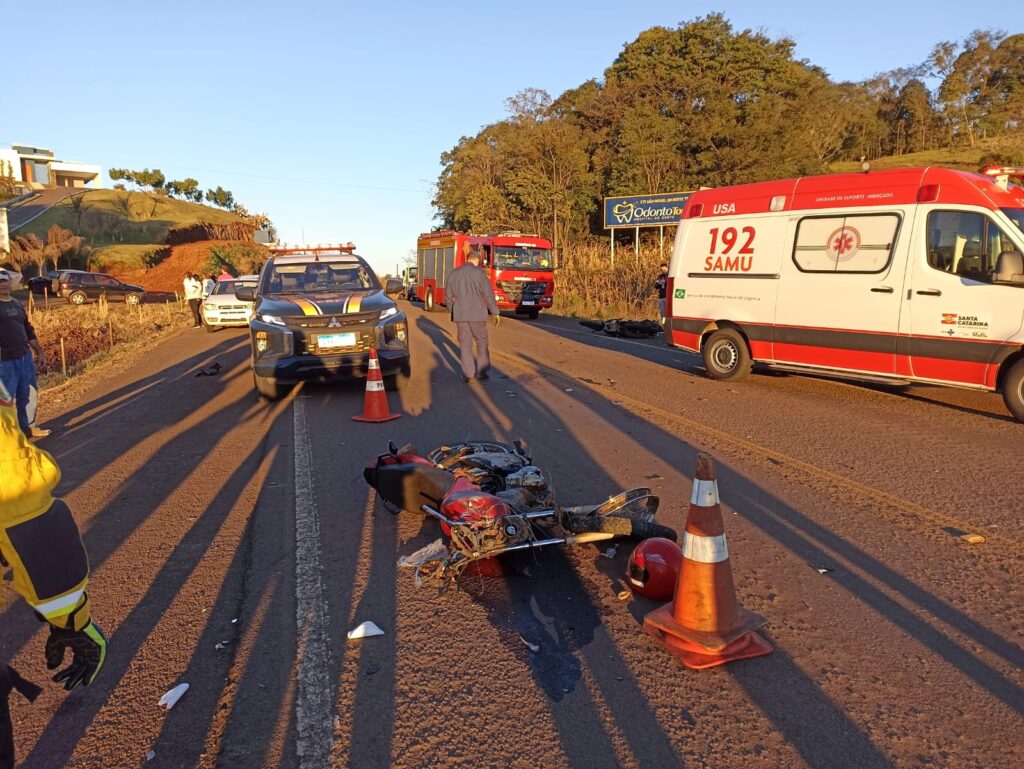 A condutora da motocicleta Honda CG, com placas de Guaraciaba, estava em parada cardiorrespiratória no momento da chegada dos socorristas. Populares já realizavam compressões torácicas, e a equipe de resgate confirmou o quadro e iniciou o protocolo de reanimação, com posterior apoio do SAMU. A vítima também apresentava fratura exposta na perna esquerda. Ela foi conduzida ao Hospital Regional Terezinha Gaio Basso pela equipe médica do SAMU.