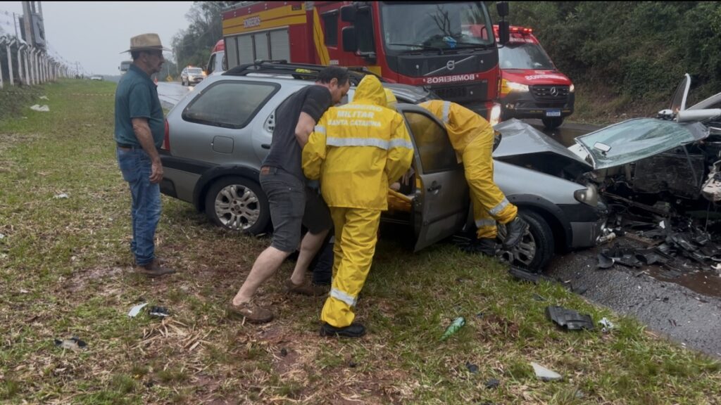 Um grave acidente de trânsito foi registrado no início da tarde deste domingo(03), na SC-484, em Guatambú, no Oeste de Santa Catarina. A colisão frontal acabou envolvendo um Palio Weekend e um Peugeot 207.