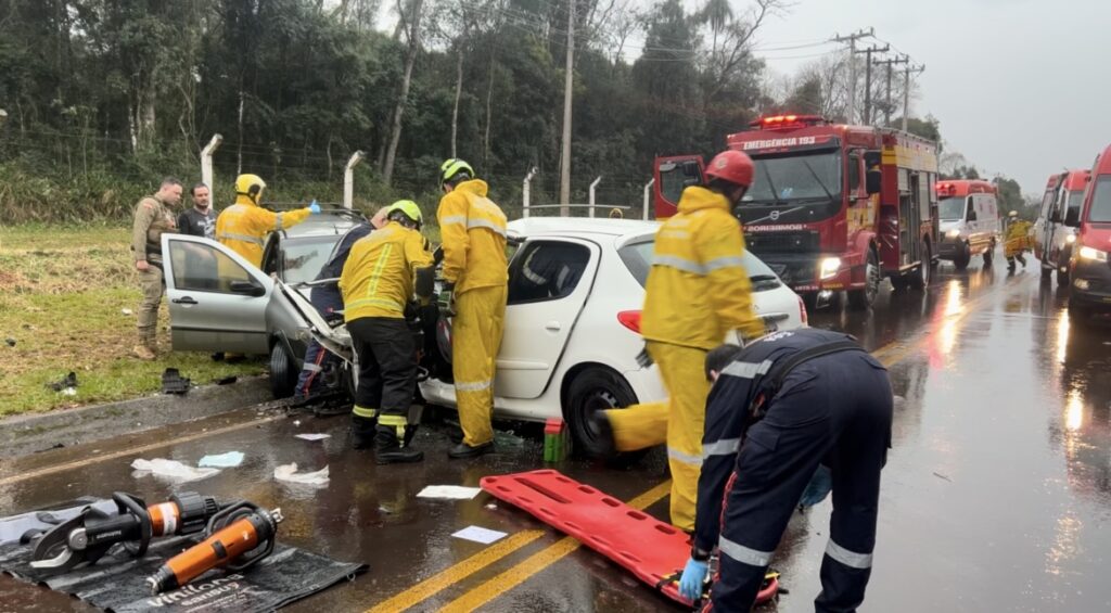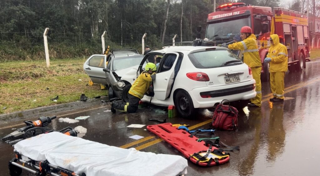 Colisão entre dois carros deixou uma vítima presa às ferragens e ao menos três vítimas em estado grave