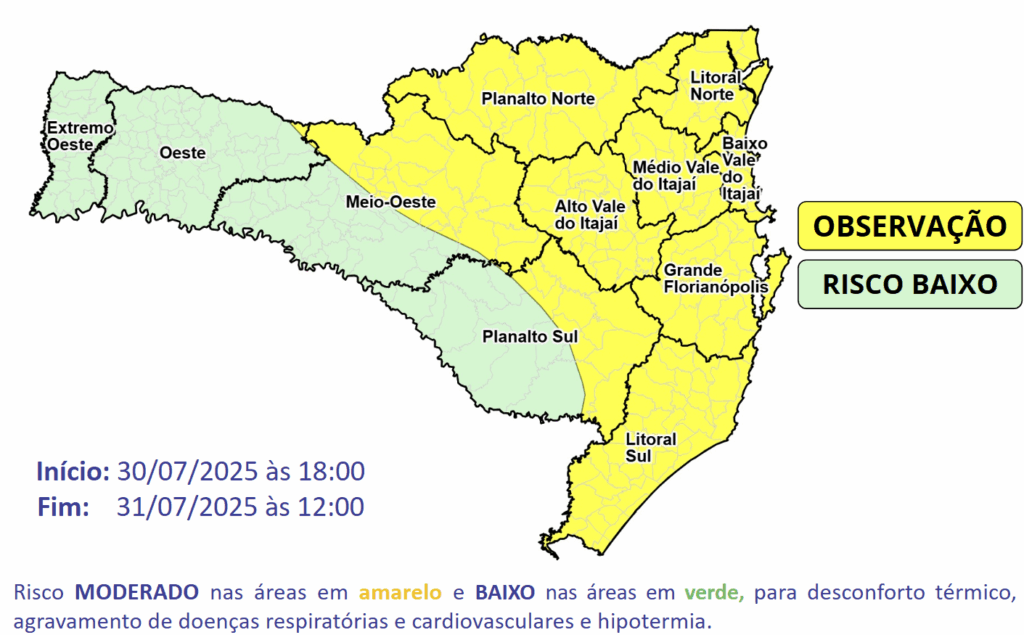 Segundo a Defesa Civil, o risco é de baixo a moderado para desconforto térmico, agravamento de doenças respiratórias e cardiovasculares e hipotermia.