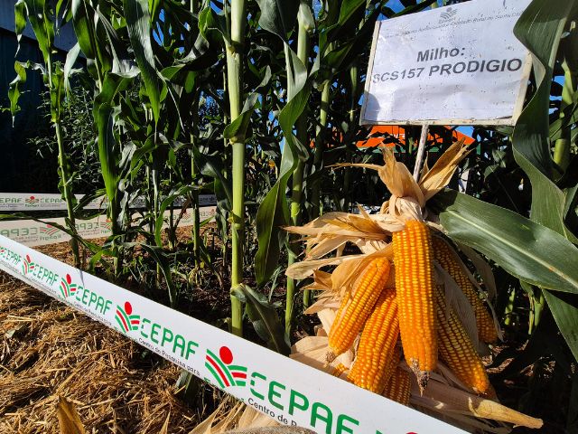 A Epagri lançou, na quarta-feira (18), um novo cultivar de milho para a agricultura familiar: o SCS157 Prodígio. A variedade de milho de polinização aberta (VPA) é fruto de um longo e minucioso trabalho de melhoramento genético, iniciado em 2012 no Centro de Pesquisa para Agricultura Familiar (Epagri/Cepaf), em Chapecó. Pensado para atender especialmente às necessidades dos agricultores do Sul do Brasil, o material foi testado em municípios com diferentes climas e tipos de solo, como Papanduva, Chapecó, Guatambu, Campos Novos e Ituporanga, garantindo ampla adaptação da cultura. O lançamento aconteceu durante o Itaipu Rural Show, em Pinhalzinho, no Oeste Catarinense.