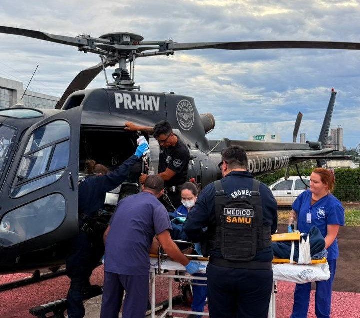 Após os procedimentos de emergência, o homem foi transportado de helicóptero até o Hospital Regional do Oeste, onde permanece sob cuidados médicos especializados. As circunstâncias do acidente não foram detalhadas, e o caso segue sendo acompanhado pelas autoridades competentes.