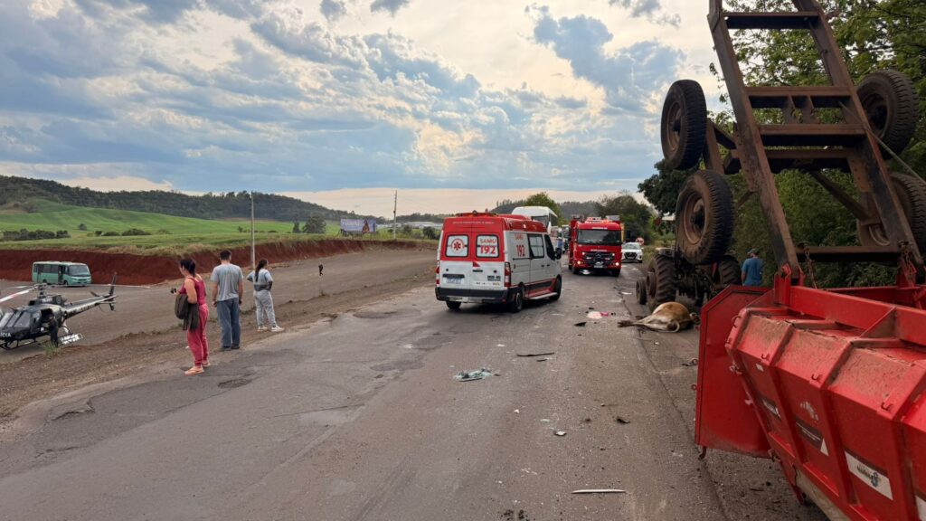Na manhã desta segunda-feira (1), um acidente envolvendo um caminhão baú e um trator foi registrado na BR-282, em Flor do Sertão, Oeste de Santa Catarina. O trator transportava uma vaca quando foi atingido na traseira pelo caminhão.