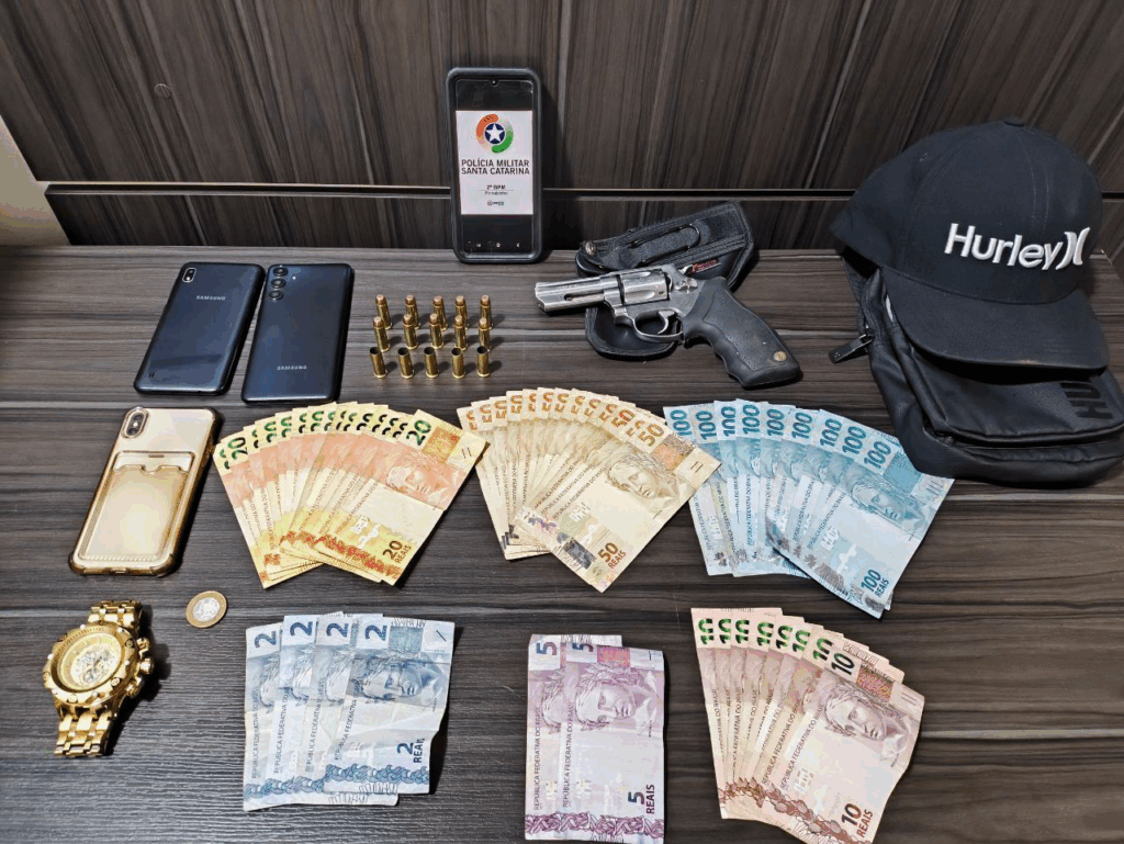 Em vistoria no veículo utilizado pelo suspeito, os policiais localizaram um revólver calibre .38, com numeração suprimida, municiado com cinco cartuchos, além de nove munições intactas e cinco estojos deflagrados. A consulta nominal confirmou que o homem possuía mandado de prisão em aberto e era foragido do sistema prisional.