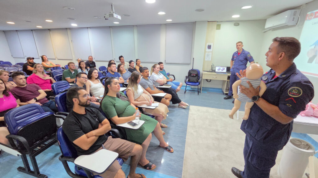 A nutricionista Tainá orienta sobre cólicas no recém-nascido e a farmacêutica bioquímica Pamela Jessyca Hoss Longgi destacou a relevância das imunizações, explicando o calendário vacinal e as diferenças entre as vacinas oferecidas na rede pública e na rede particular.Durante o curso, os participantes também puderam conhecer a maternidade do hospital e esclarecer dúvidas diretamente com os profissionais da instituição.