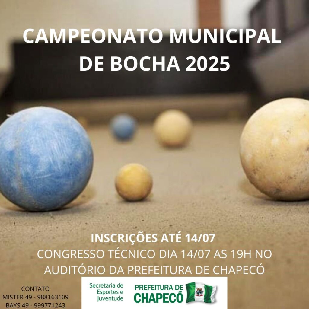 Estão abertas as inscrições para o Campeonato Municipal de Bocha 2025, organizado pela Prefeitura de Chapecó, por meio da Secretaria de Esportes e Juventude (SEJU). As equipes interessadas podem se inscrever até o dia 14 de julho (segunda-feira) — data em que também será realizado o Congresso Técnico, no auditório da Prefeitura.