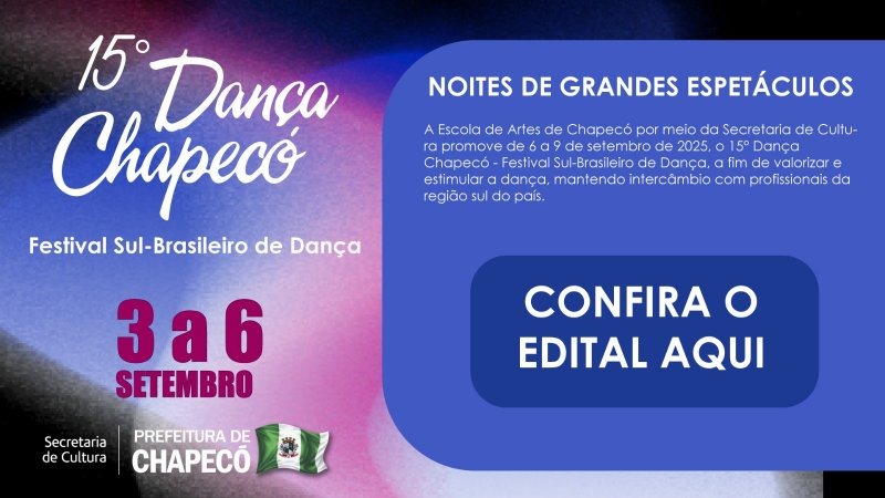 A Prefeitura de Chapecó, por meio da Secretaria de Cultura, promove de 3 a 6 de setembro de 2025, o 15º Dança Chapecó – Festival Sul-Brasileiro de Dança, a fim de valorizar e estimular a dança, mantendo intercâmbio com profissionais da região sul do país.