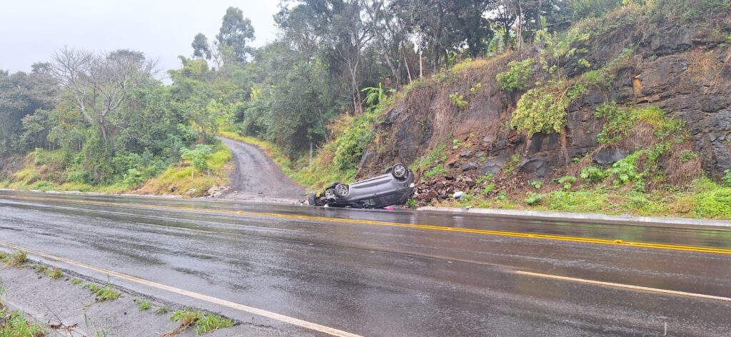 Condutor perdeu o controle do veículo sob chuva e bateu em barranco antes de capotar