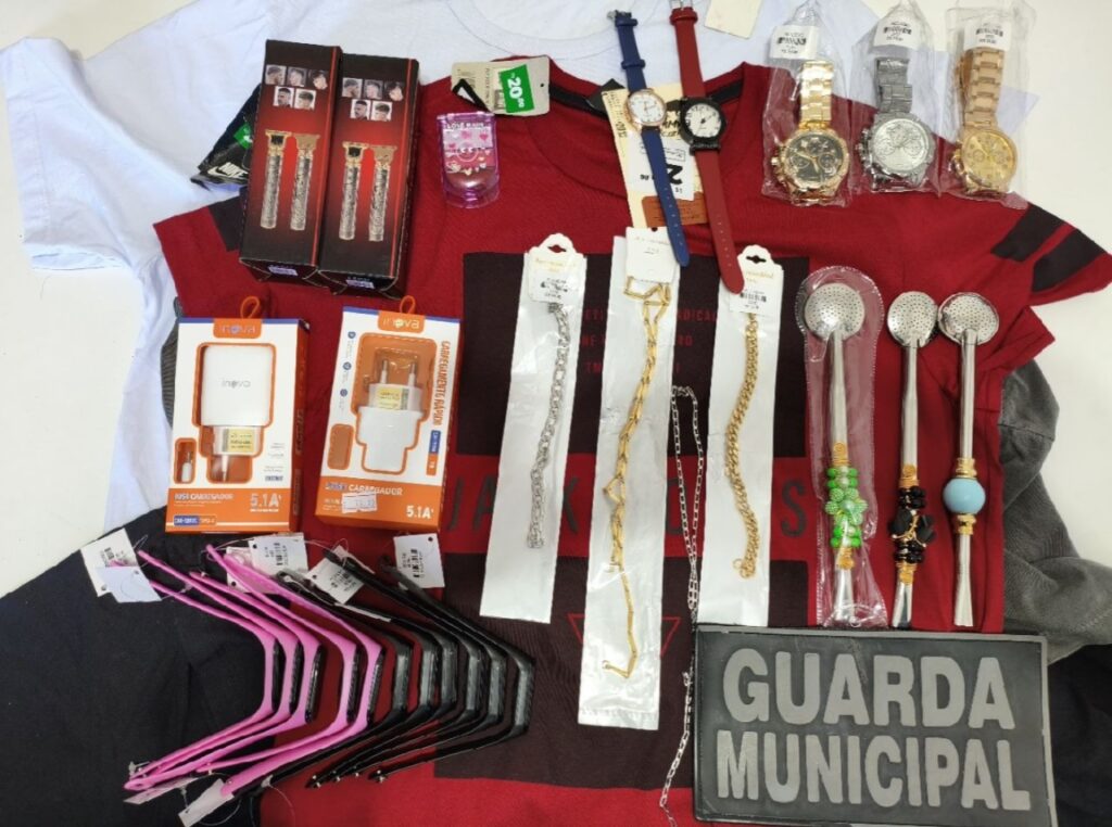 Durante a busca em seus pertences, foram encontrados os seguintes itens: cinco camisetas, três bombas de chimarrão, um kit de maquiagem, dois aparadores de barba, dois carregadores de celular, 11 relógios digitais de pulso, quatro correntes e cinco relógios analógicos, totalizando aproximadamente R$ 650.