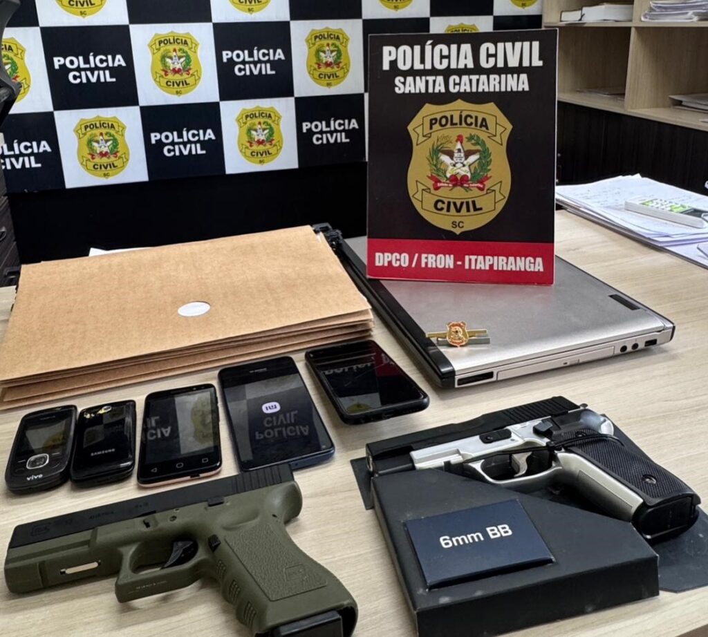 Durante o cumprimento da ordem judicial, foram apreendidos cinco aparelhos celulares, um notebook, além de pastas contendo contratos e documentos pessoais de possíveis vítimas. Também foi localizado um broche do Poder Judiciário Federal, bem como duas pistolas de airsoft, sendo uma delas com aparência semelhante a uma pistola Glock.
