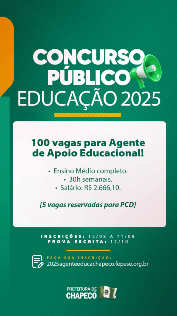 A Prefeitura de Chapecó lançou, nesta terça-feira (12), concurso público para a Secretaria de Educação. São 100 vagas para o cargo de Agente de Apoio Educacional, com salário de R$ 2.666,10 e carga horária de 30 horas semanais. Cinco vagas são reservadas para pessoas com deficiência.