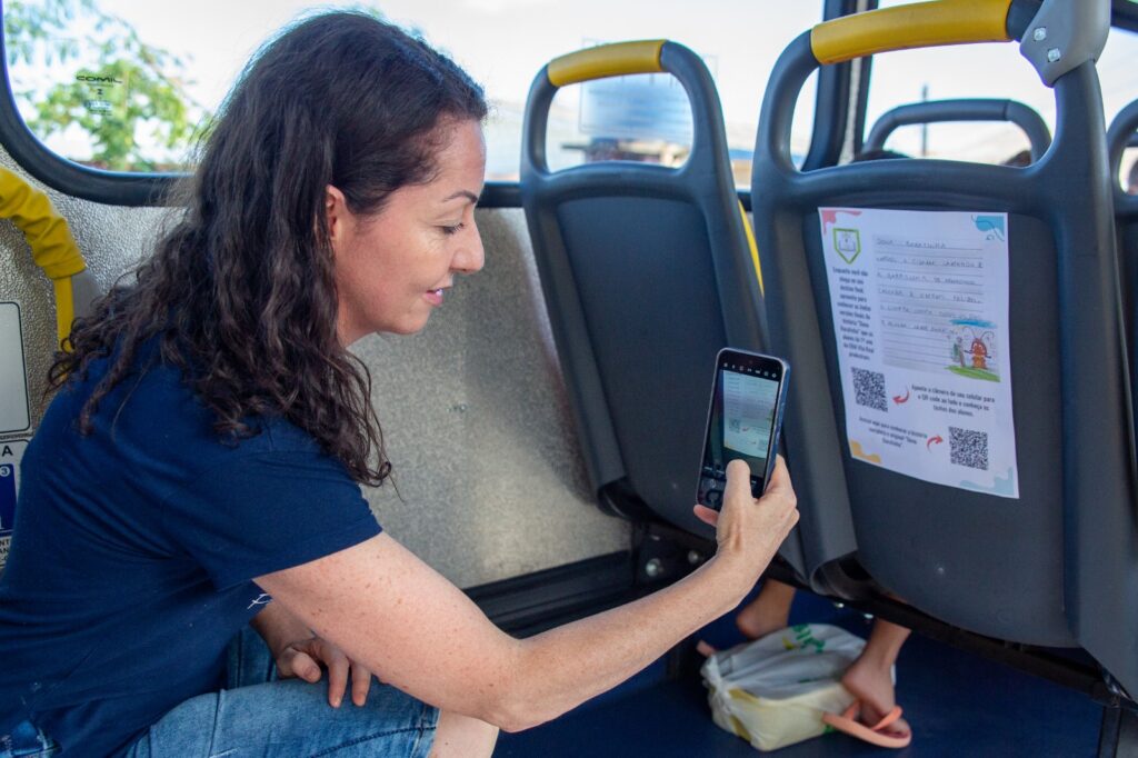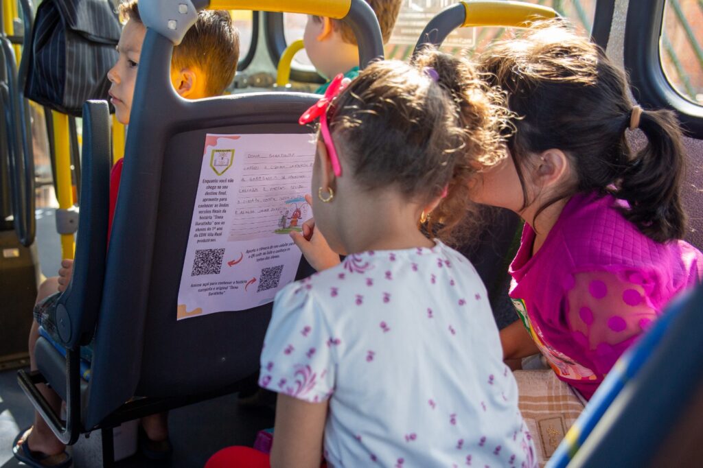 No projeto, inspirado na história “Dona Baratinha”, alunos criaram novos finais para o conto. As produções foram digitalizadas, transformadas em arquivos com QR Codes e disponibilizadas nos ônibus que circulam pelo bairro, permitindo que passageiros acessassem e lessem as histórias durante o trajeto.