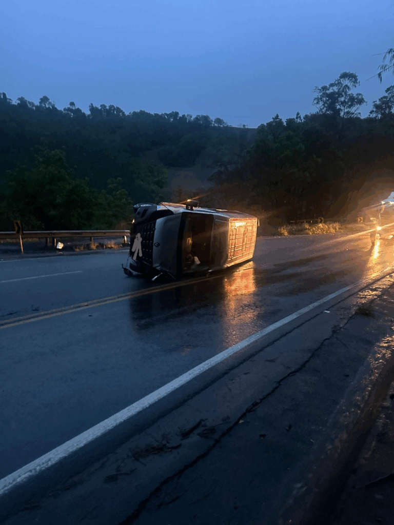 O condutor do veículo, um homem de 22 anos, estava consciente e orientado quando as equipes de atendimento chegaram ao local. O veículo, um Ford Master, tombou e ficou no meio da pista. O motorista apresentava ferimentos leves, que foram limpos e avaliados pela equipe de resgate.